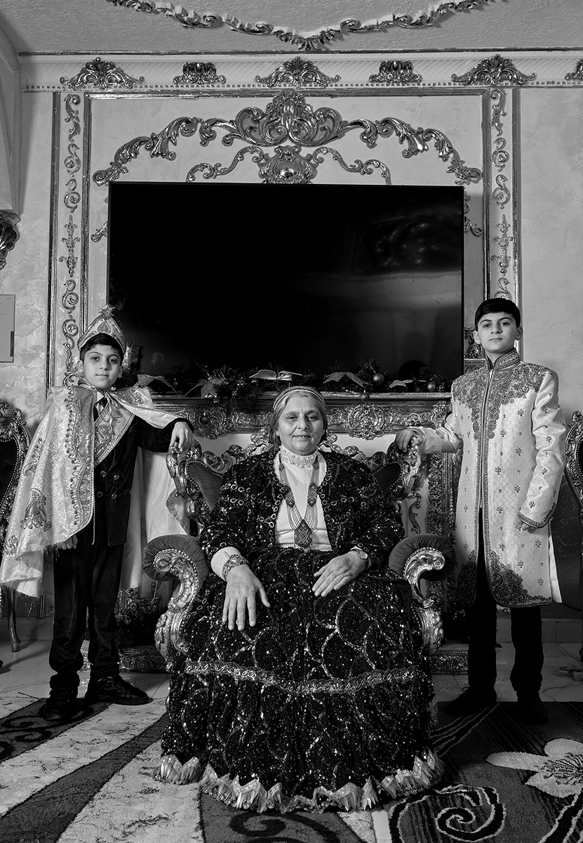 One of the more resonant photos in the series is a portrait of Maria, the Mother of Keldelari. Maria is responsible for the lineage and for upholding traditions of the Roma people, having given birth to eight children, 64 grandchildren, and 108 great-grandchildren as of 2025. Dorohovich portrays her in a self-assured light, with her chin lifted slightly, her hands clasped in her lap, and her eyes meeting the lens. What struck me most was the sense that Maria was trusted the photographer to historicize her family with intention.