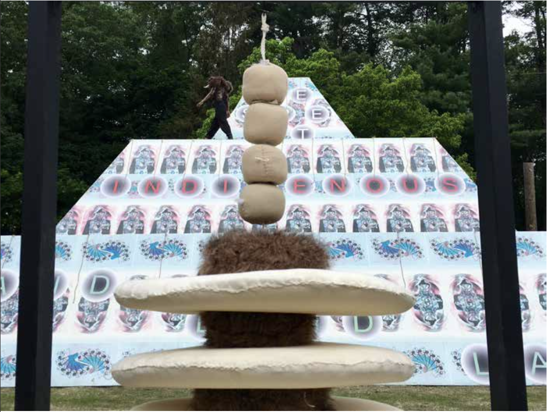 For Americans of European descent, the deep dive to understand the First Peoples of the Americas demands a deeper sense of history and time than we live with day-to-day. Jeffrey Gibson’s hollow, 21-foot-high ziggurat, encamped for the year on a grassy plain below the castle at the deCordova Museum, is here to acquaint us with our ignorance. A nearby sign pronounces a truth dating from 1492: “You are Standing on Native Land.” Gibson, a member of the Mississippi Band of Choctaw Indians and half Cherokee, has chosen the shape of a stepped pyramid to quote the giant, 100-foot-high earthwork hand-built by his Indigenous forebears at Cahokia, in what is now southern Illinois. This great city of the ancient Mississippian civilization scattered along the great river’s Midwestern tributaries, was larger than the Paris of its time. It hosted ritual gatherings, collected tribute and staged … [Read more...] about A GENEROUS PATTERN OF COLLABORATION: GIBSON USES DECORDOVA EXHIBITION AS LIVING BILLBOARD